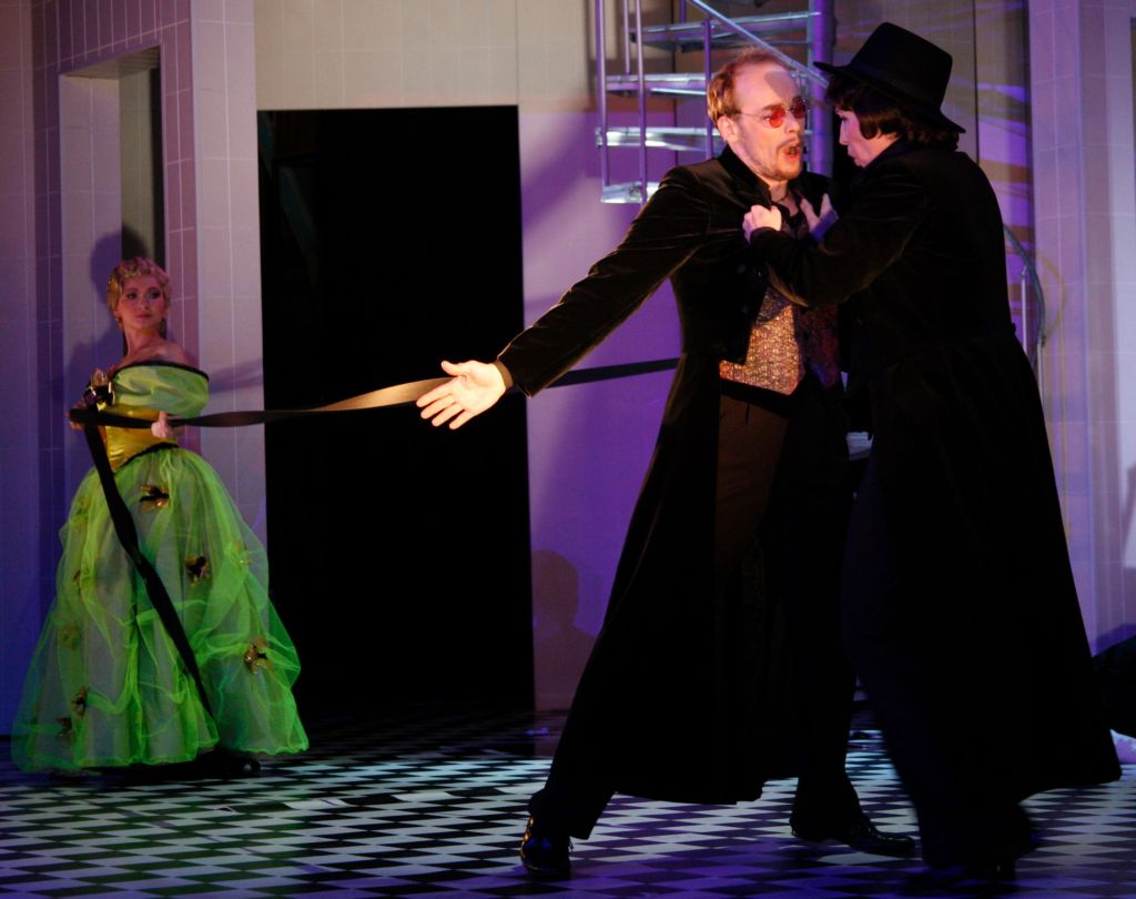 Ohne Pause ging das Vorspiel in den Olympia-Akt über. Coppelius stand oben auf der Galerie und warf ein Bündel schwarzer Bänder unter die Choristen, die dann quasi als Marionetten vom Widersacher gesteuert wurden. Von ihm bekam Hoffmann auch die rosarote Brille. |