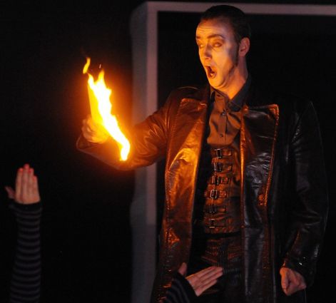 Dann ging Alles ganz schnell. Mirakel legte die Mutter in das offene Sarg-Buch und schloss den Deckel. Hoffmann warf sich der sterbenden Antonia zu Füßen. Zynisch entzündete Mirakel Kerzen für die tote Antonia. Es gab langen Applaus für diesen perfekt dargestellten Akt. Und zweite Pause. |