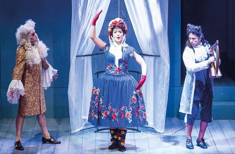 Der Umbau zum Olympia-Akt geschah schnell auf offener Bühne, obwohl das flensburger Theater keine Drehbühne hat. Spalanzani war als Rokoko-Figur und Hansdampf-in-allen-Gassen charakterisiert. Olympia wartete hinter einem Gazevorhang. Der Konflikt Coppelius – Spalanzani wurde gut dargestellt. Spalanzanis Festgäste, in aufwändigen und fantasievollen Rokokokostümen kam in Tanzschritten hereingesteppt. Olympia dagegen trug ein buntes Folklorekleid mit Reifrock. Schnell und präzise brachte der Chor das Lob auf Olympias Augen, begleitet von lebhafter Mimik und Gestik. |