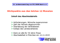 Bei der Mitgliederversammlung des Landesverbands Bayern von PRO BAHN gab es kürzlich einen düsteren Blick in eine mögliche Zukunft: Für 2015 wurde die Auflösung des Verbands prognostiziert, falls bestimmte negative Entwicklungen nicht aufgehalten werden können. Diese Entwicklungen und ihre Ergebnisse wurden dabei wie folgt beschrieben: