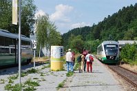 Ab Volary folgt ein landschaftlich sehr schöner Streckenabschnitt. Mit Kubova Huť erreichen wir den höchst gelegenen Bahnhof Tschechiens, danach führt die Fahrt über Vimperk/Winterberg mit schönem Blick auf Schloss und Altstadt. Ich sitze im Beiwagen zur ČD-Baureihe 810 ("Brotbüchse"), in dem sich die Eckfenster so öffnen lassen, dass man fotografieren kann, und nutze diese Gelegenheit auch einige Male. In Strakonice haben wir die Anfangsverspätung fast aufgeholt. Allerdings wird auch der Zug nach Budweis mit zehn Verspätungsminuten angekündigt. Da ist leider Alltag auf der wichtigen, aber weitgehend eingleisigen Strecke zwischen Pilsen und Budweis. |