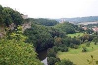 Der Anleger Rudelsburg liegt außerhalb der Ortschaft Saaleck. Die Saale stößt hier nach einer Schleife auf den Höhenzug, der sich von der Burg Saaleck bis nach Bad Kösen zieht. Mein Weg (komoot.de, mapy.cz) führt zunächst ein Stück zwischen Wald und Weiden daher, dann geht es nach links, teilweise über Stufen, steil bergauf. Oben kommt man zunächst zwischen den beiden Burgen heraus. Ich wende mich nach rechts und überwinde die letzten Höhenmeter zur Burg Saaleck. Schon vom Vorplatz aus hat man eine tolle Aussicht auf das Saaletal, den Ort und das auf den gegenüberliegenden Höhen liegende Ausflugslokal Himmelreich. Für einen Euro Eintritt kann man sich die Burgruine anschauen und den Westturm besteigen. Während sich im Ostturm eine Kunstaustellung befindet, erfährt man beim Aufstieg im Westturm einiges zur Geschichte der Burganlage. Oben angekommen hat man einen einmaligen Rundumblick. |
